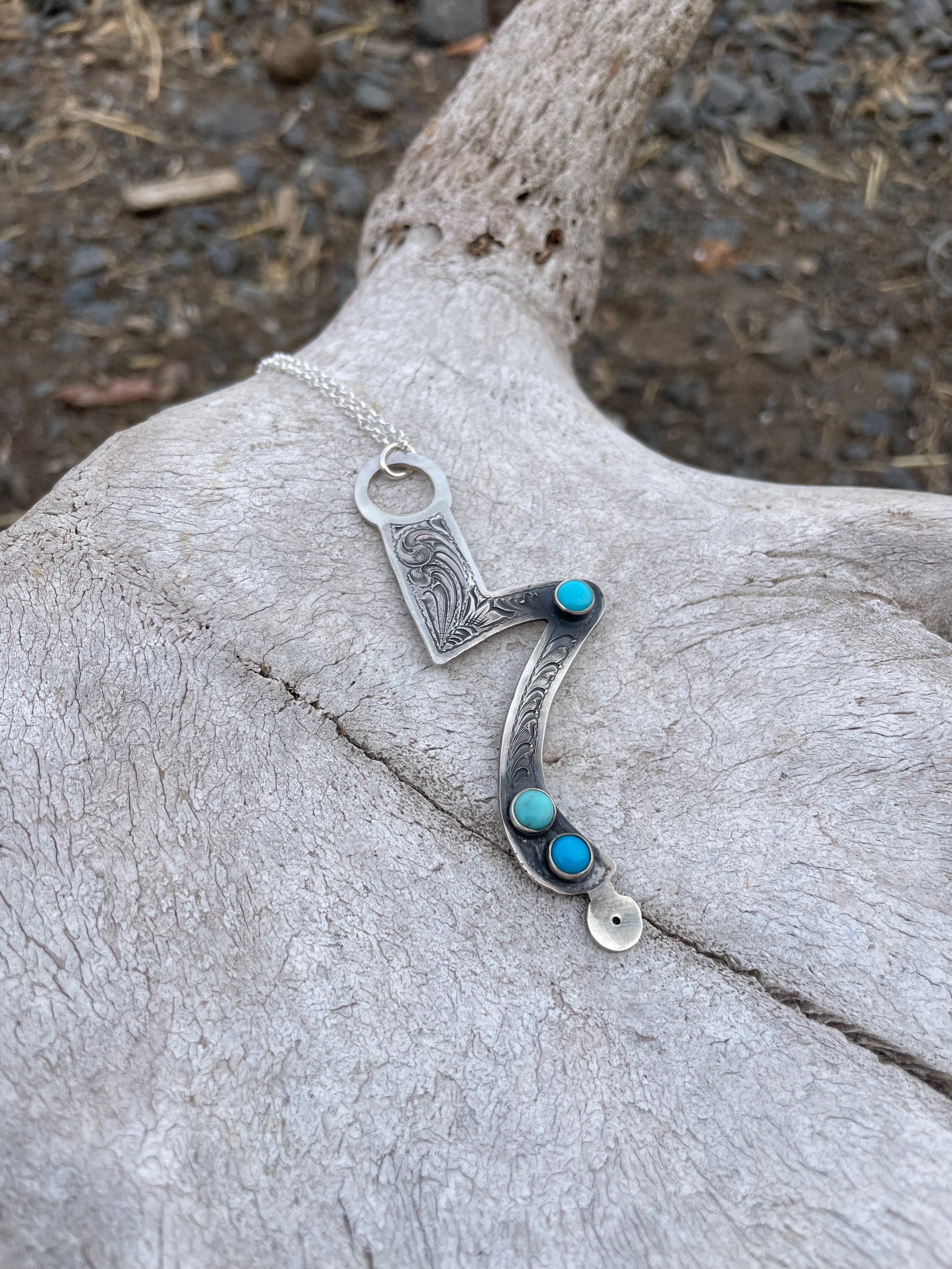 3 inch sterling 7 cheek bit pendant. Solid sterling on sterling adjustable chain. Genuine turquoise.