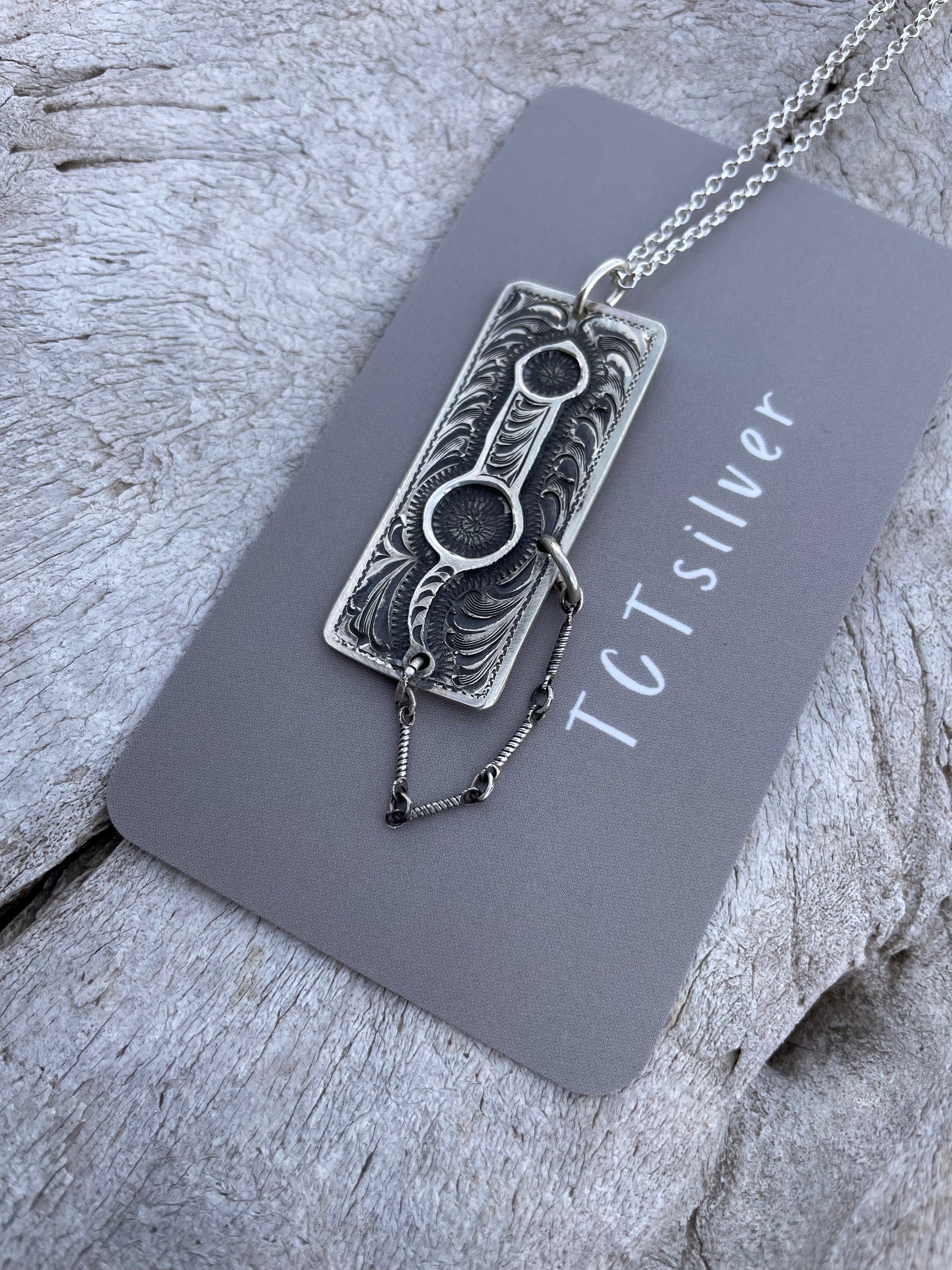 Bar necklace but bridle bit style complete with rein chain. Sterling silver and hand engraved