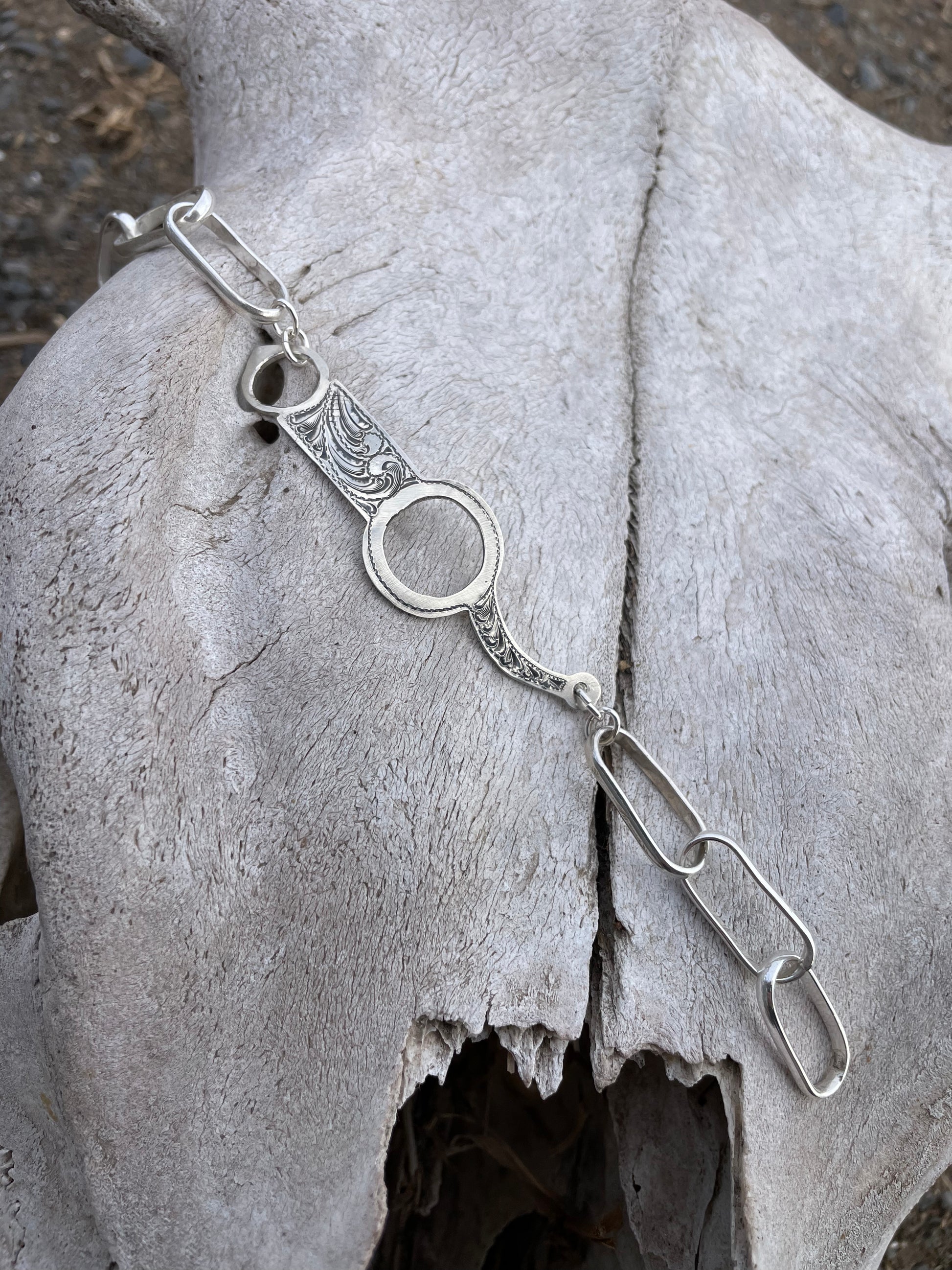 Fits up to a 8 inch wrist. Sterling silver handmade bracelet with hand engraved bridle cheek