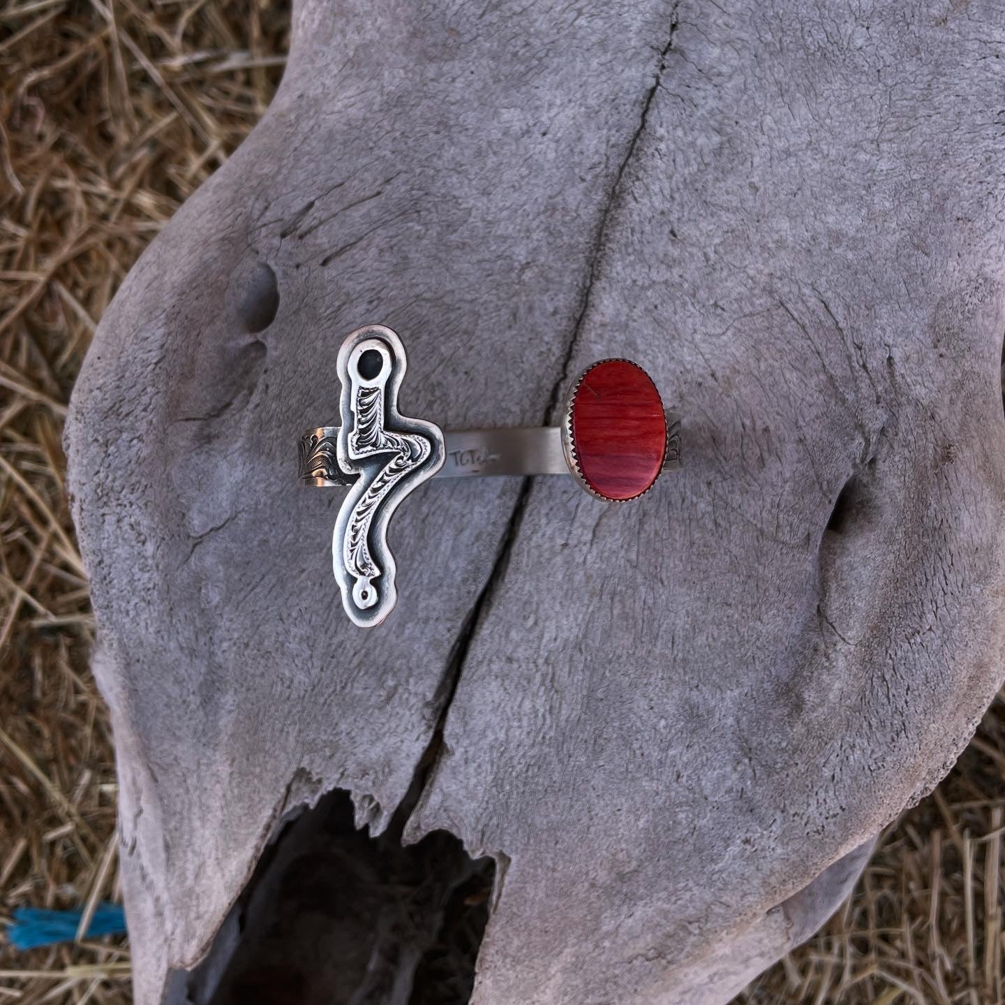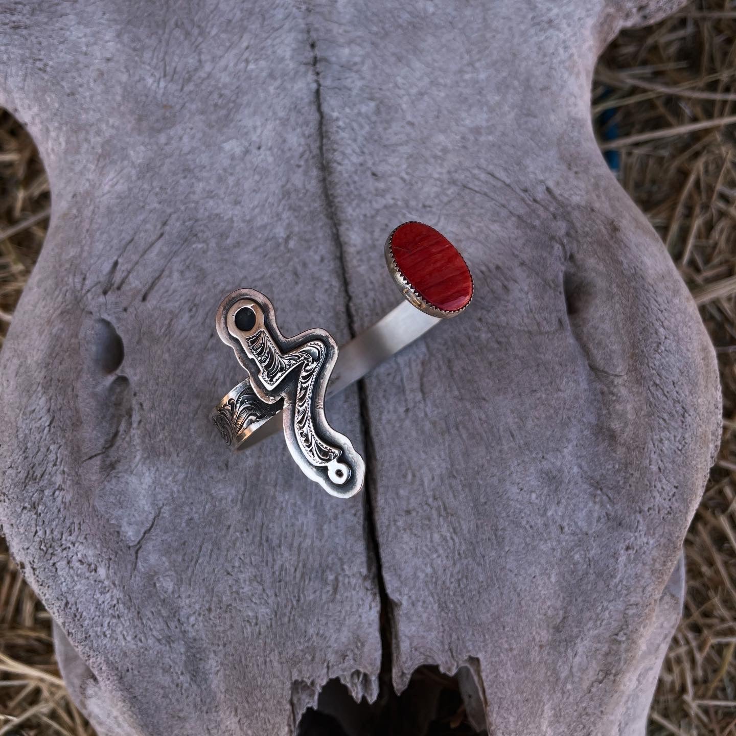 Adjustable sterling silver cuff fully engraved with spiny oyster stone and seven cheek