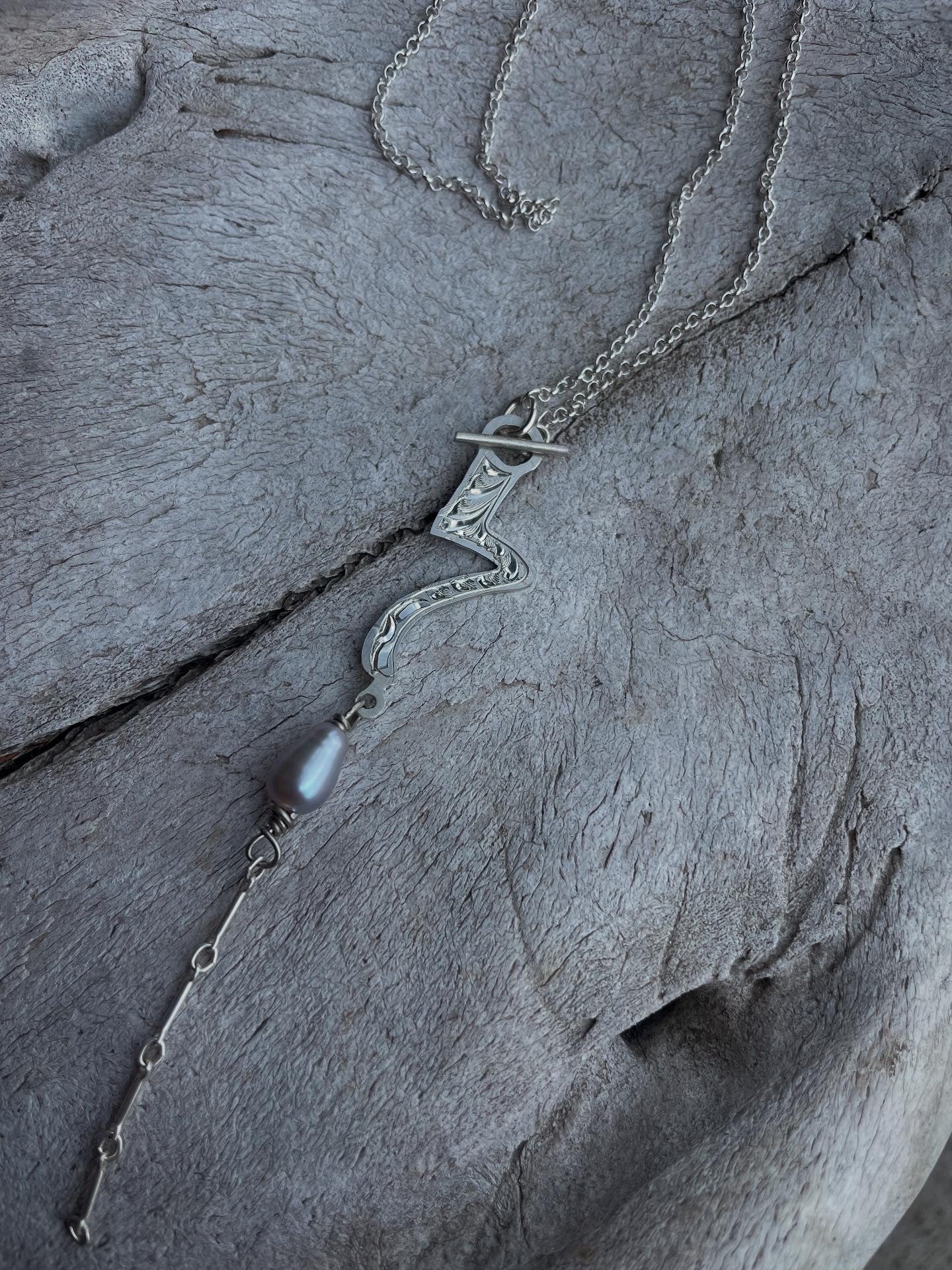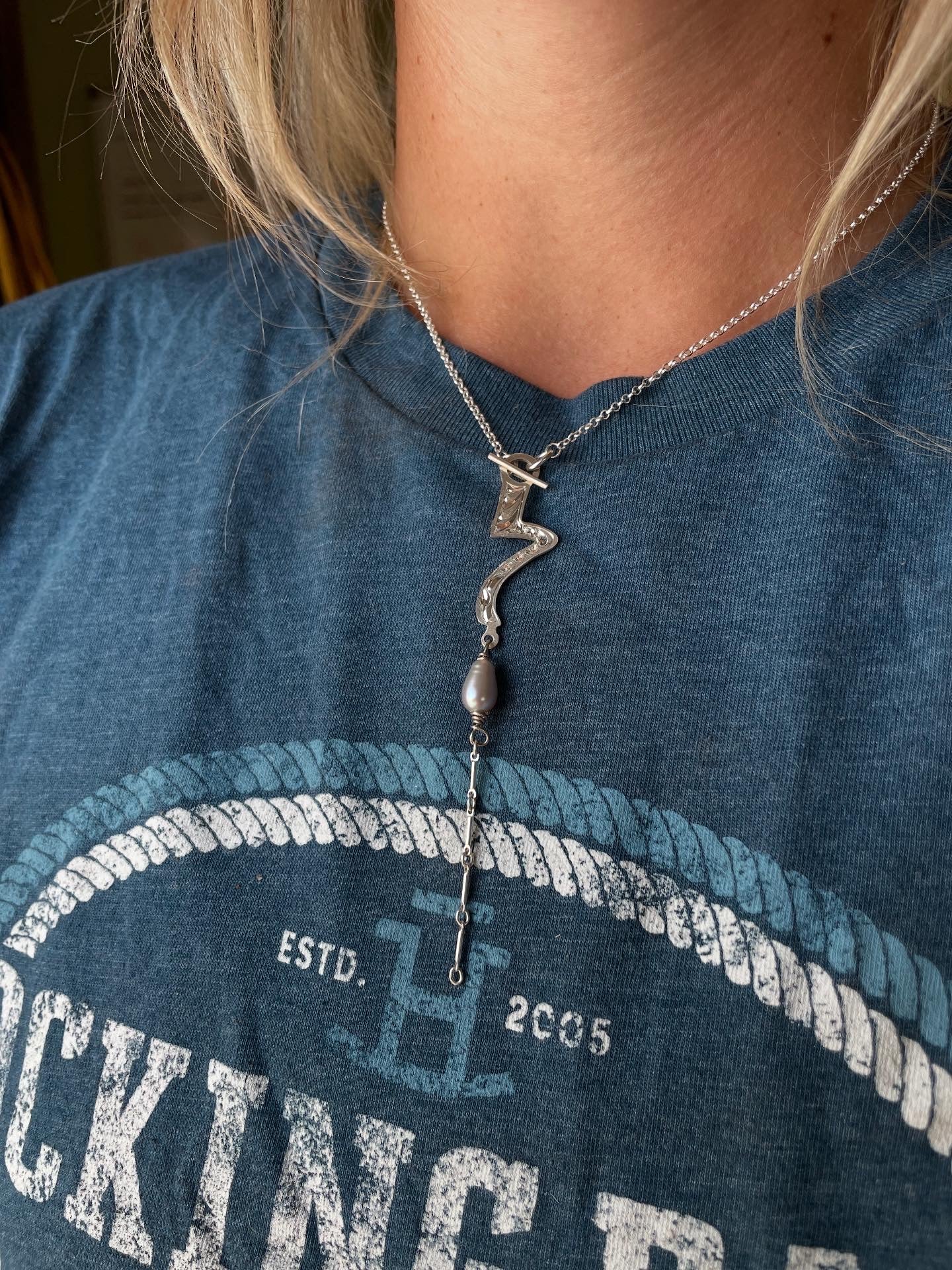 Sterling silver toggle necklace with engraved 7 cheek bit charm and pearl
