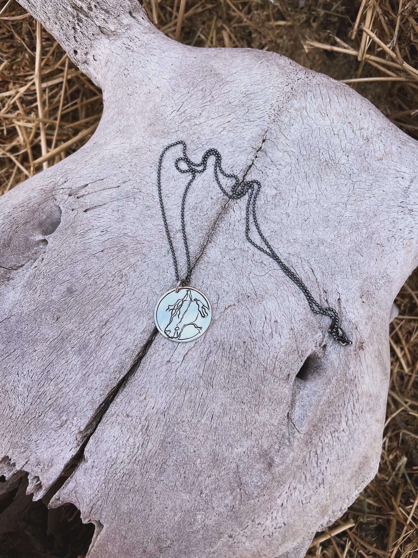 Sterling silver hand engraved whimsical squiggle pony charm on sterling oxidized chain.