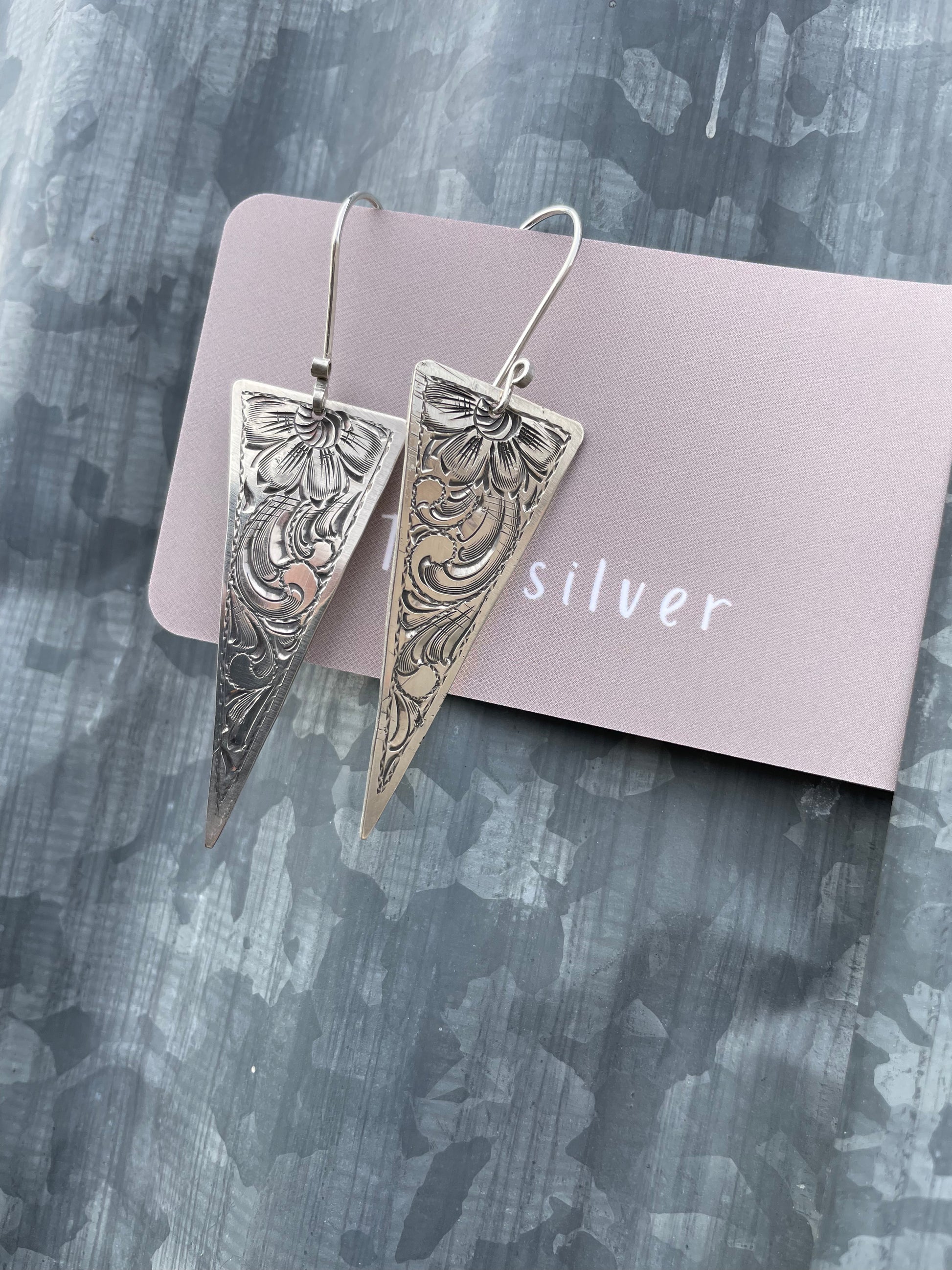 Solid sterling lightweight XL drop earrings. Hand engraved. Just shy of 3 inches