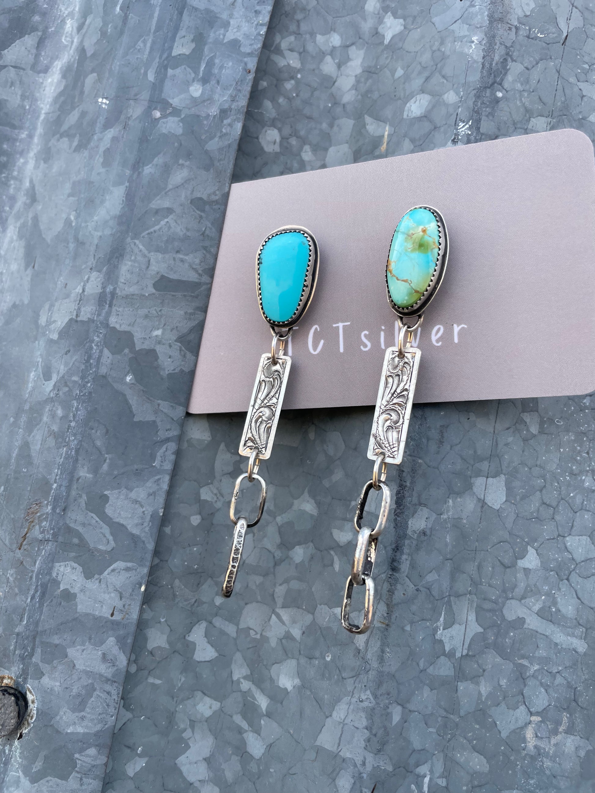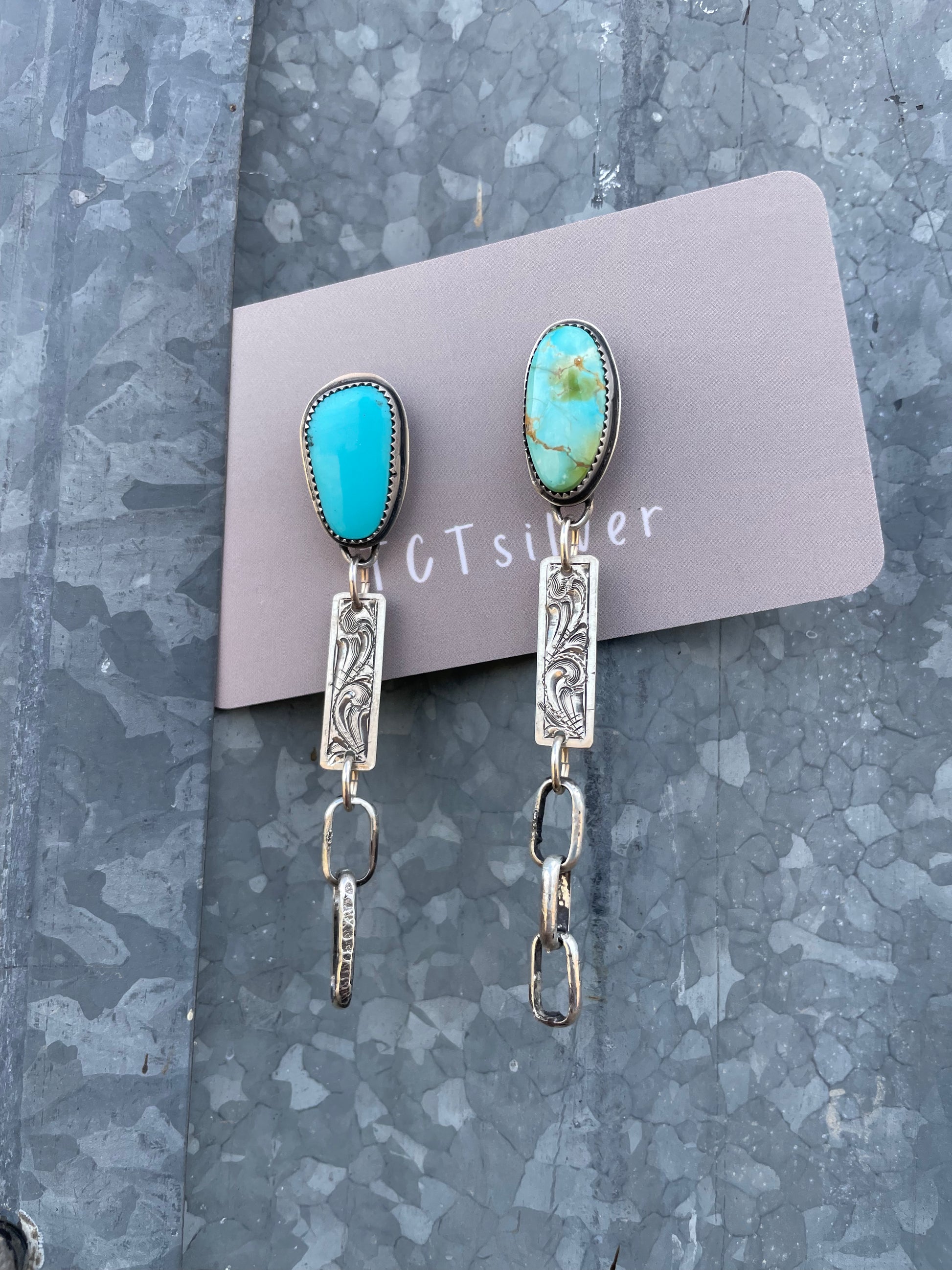 3 inches in length, solid sterling silver and variated turquoise, hand engraved